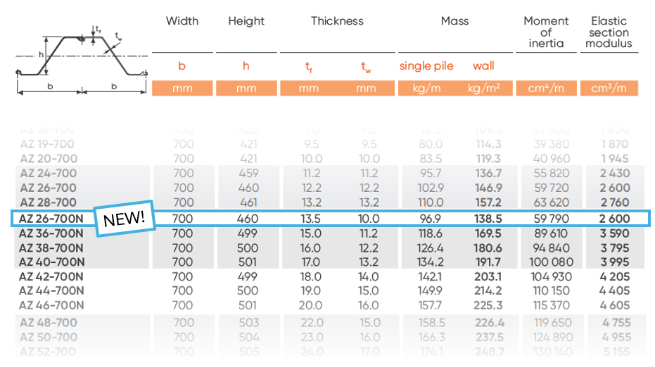 In this handy A5 flyer, you will find details on Width, Height, Thickness, Mass, Moment of Inertia, and Elastic Section Modulus for each type of Z & U sheet pile profiles.