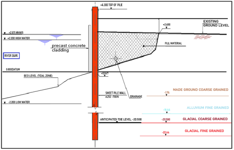 The solution included a cantilever steel sheet pile wall designed to withstand a 1:200 year flood event, with heavy-duty AZ-series piles installed in the western section and PU 32-1 piles in the eastern section, tailored to the variable ground conditions. Installation required advanced techniques such as vibratory and impact hammers, toe reinforcement, and pre-drilling to ensure stability and alignment, especially in challenging ground profiles. Environmental and logistical challenges were managed through vibration and noise controls, daytime work schedules, and temporary fencing to safeguard rail operations, while precast concrete cladding supported ecological integration along the foreshore.