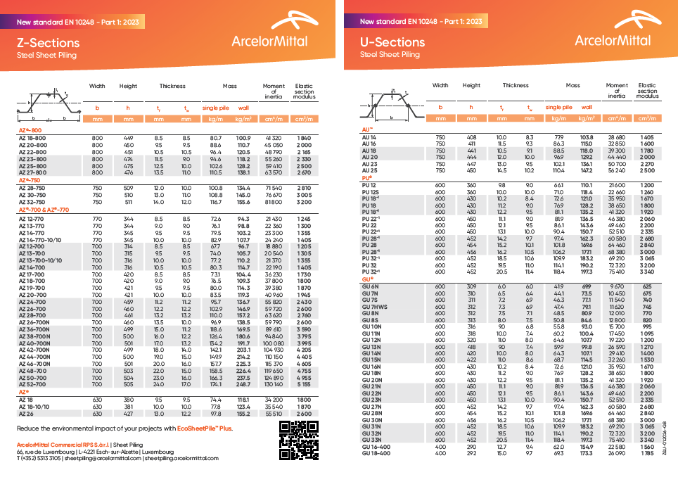 W tej poręcznej ulotce w formacie A5 znajdziesz szczegółowe informacje na temat szerokości, wysokości, grubości, masy, momentu bezwładności i modułu sprężystości przekroju dla każdego typu profili ścianek szczelnych typu Z i U.